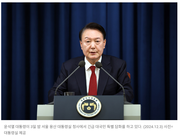 - 윤석열 대통령은 2024년 12월 3일 비상계엄령을 선포함