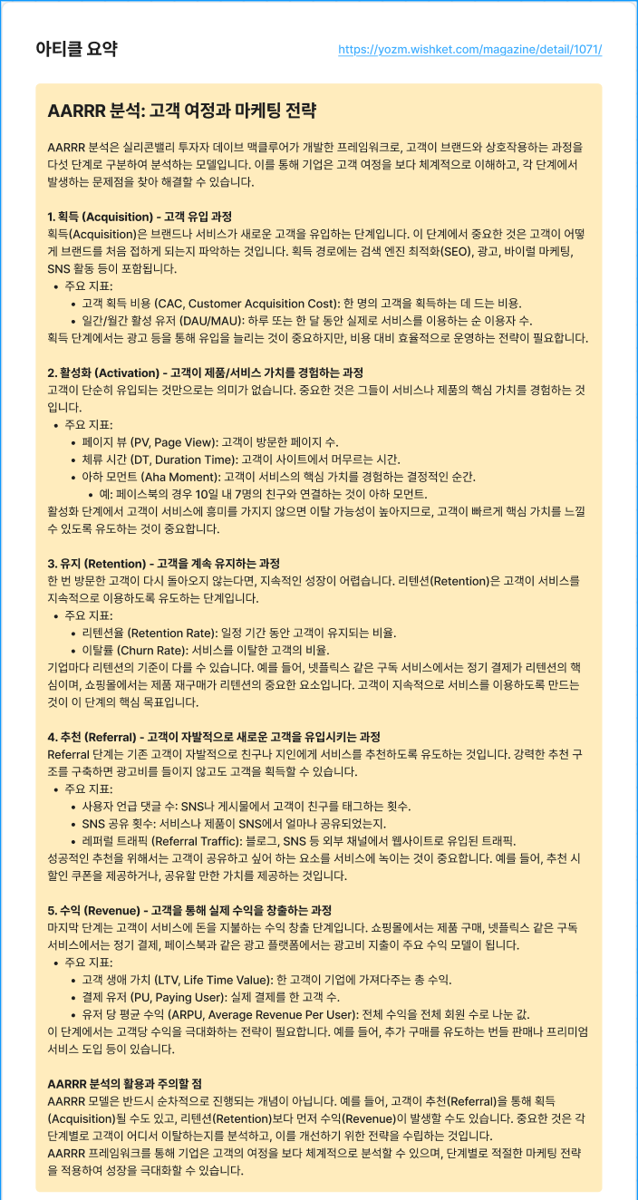 AARRR 프레임워크를 통해 기업은 고객의 여정을 보다 체계적으로 분석할 수 있으며, 단계별로 적절한 마케팅 전략을 적용하여 성장을 극대화할 수 있습니다.