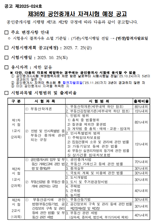 2025년 제36회 공인중개사 시험은 다음과 같이 예정되어 있습니다: