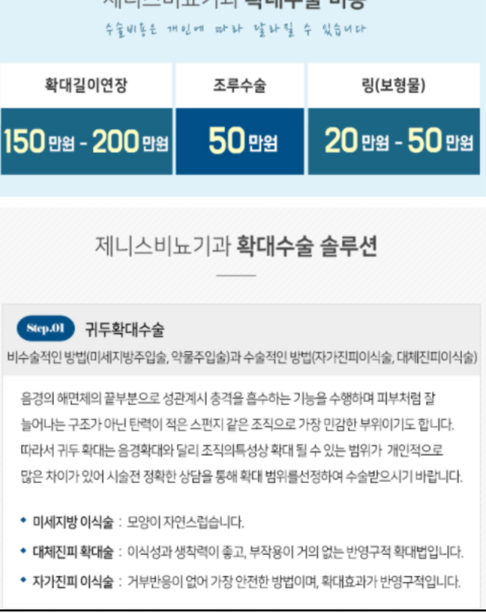| 실리콘 삽입 확대술 | 30만 ~ 150만 | 절개 수술, 반영구적 효과 |