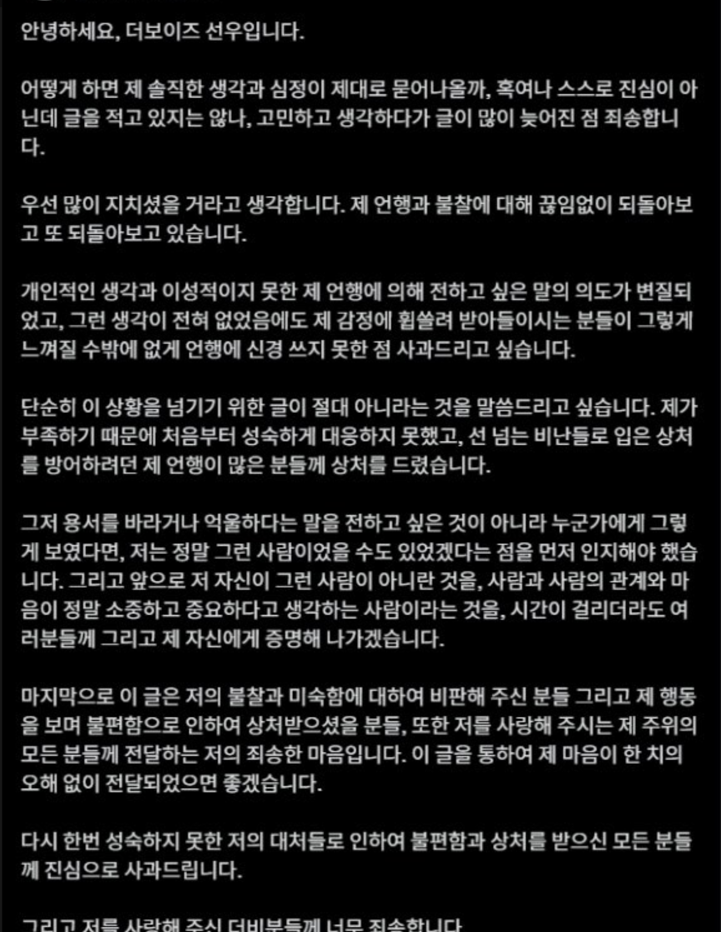 논란이 커지자 선우는 본인의 SNS를 통해 장문의 사과문을 게재했습니다. 사과문에서 그는 다음과 같은 내용을 담았습니다.