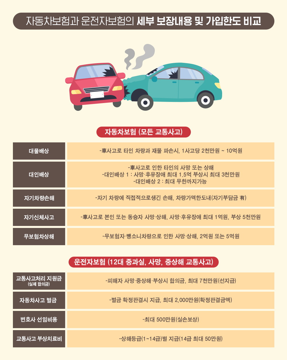 - 자동차보험은 민사적 책임(대인, 대물)을 보장하고, 운전자보험은 형사적 책임(벌금, 변호사비)을 보장합니다.