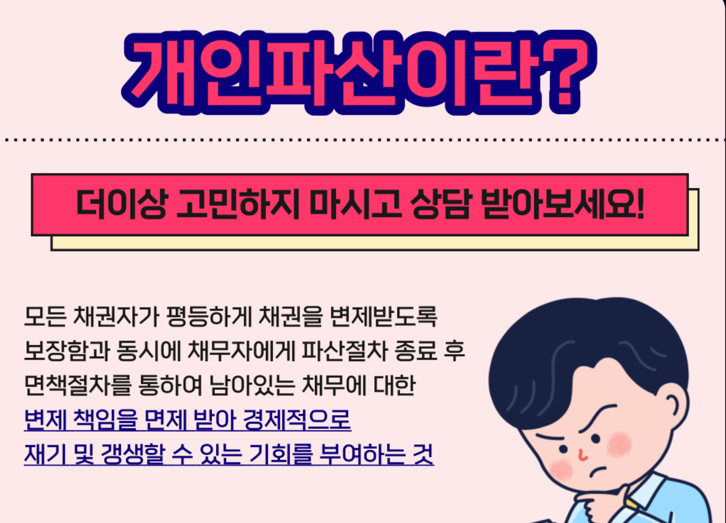 • 개인파산은 모든 부채를 탕감받을 수 있지만, 세금, 범죄로 인한 손해배상, 일부 보증채무는 면책되지 않습니다.