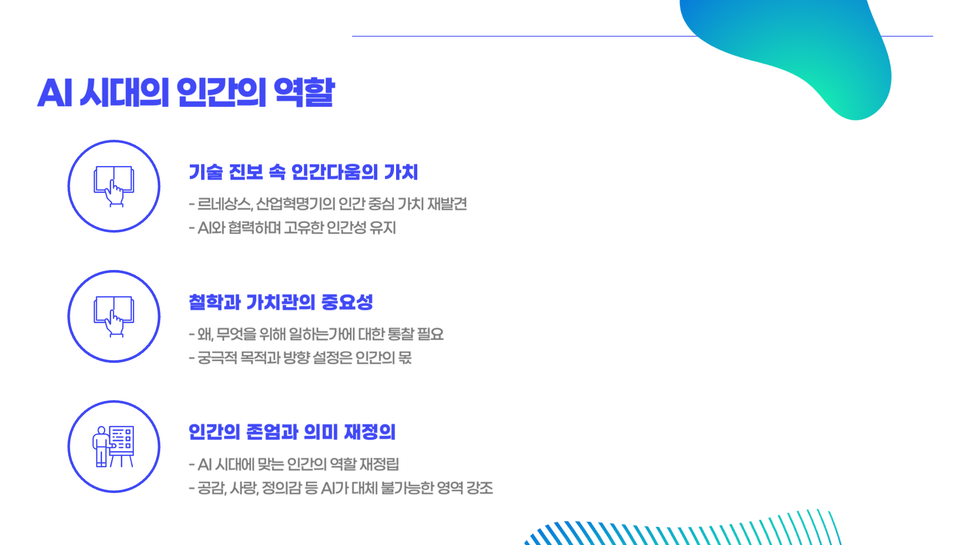 AI가 이제 사람의 사고 영역까지 대체할 수 있다는 얘기가 나오는 시대에, 궁극적으로 인간에게 남는 고유한 역할은 무엇인가를 깊이 고민해야 합니다. 저는 그 답이 **“철학과 가치관, 그리고 행동”**에 있다고 믿습니다. 지적 능력 면에서 AI가 인간을 추월해가는 상황에서, 인간은 왜 그리고 무엇을 위해 그 일을 하는가에 대한 철학적 통찰을 가져야 합니다. 역사를 돌아보면 르네상스나 산업혁명기에도 기술의 진보 속에서 인간다움의 가치를 재발견한 흐름이 있었습니다. 르네상스 시기 인간 중심의 휴머니즘이 꽃피며 예술과 과학 혁명이 일어났고, 산업혁명 때에도 러다이트 운동 등의 시행착오를 거치며 노동의 가치와 인간의 권리에 대한 성찰이 이뤄졌습니다. 마찬가지로 AI 혁명기인 지금, 우리는 인간의 존엄과 의미를 다시 정의해야 합니다. AI가 대부분의 사무와 판단을 해준다면, 인간은 어떤 가치 기반으로 무엇을 결정할지가 중요해집니다. AI는 수단과 방법을 제시해줄 수 있지만, 궁극적 목적과 방향은 인간만이 설정할 수 있기 때문입니다.
