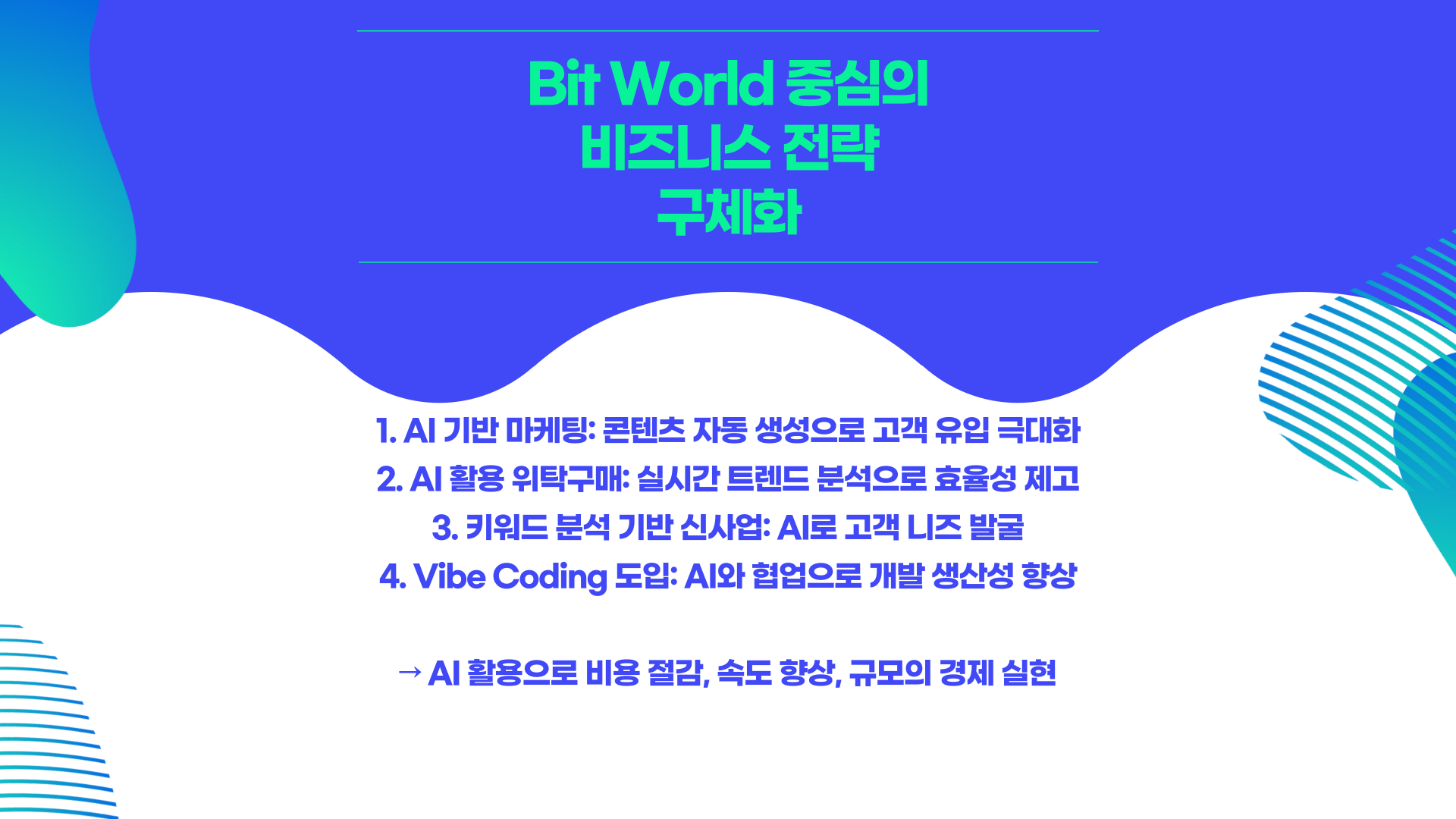 이상의 분석을 바탕으로, 저는 디지털 영역(Bit World)에서 우선 AI를 최대한 활용하는 사업 전략을 구체화하고자 합니다.