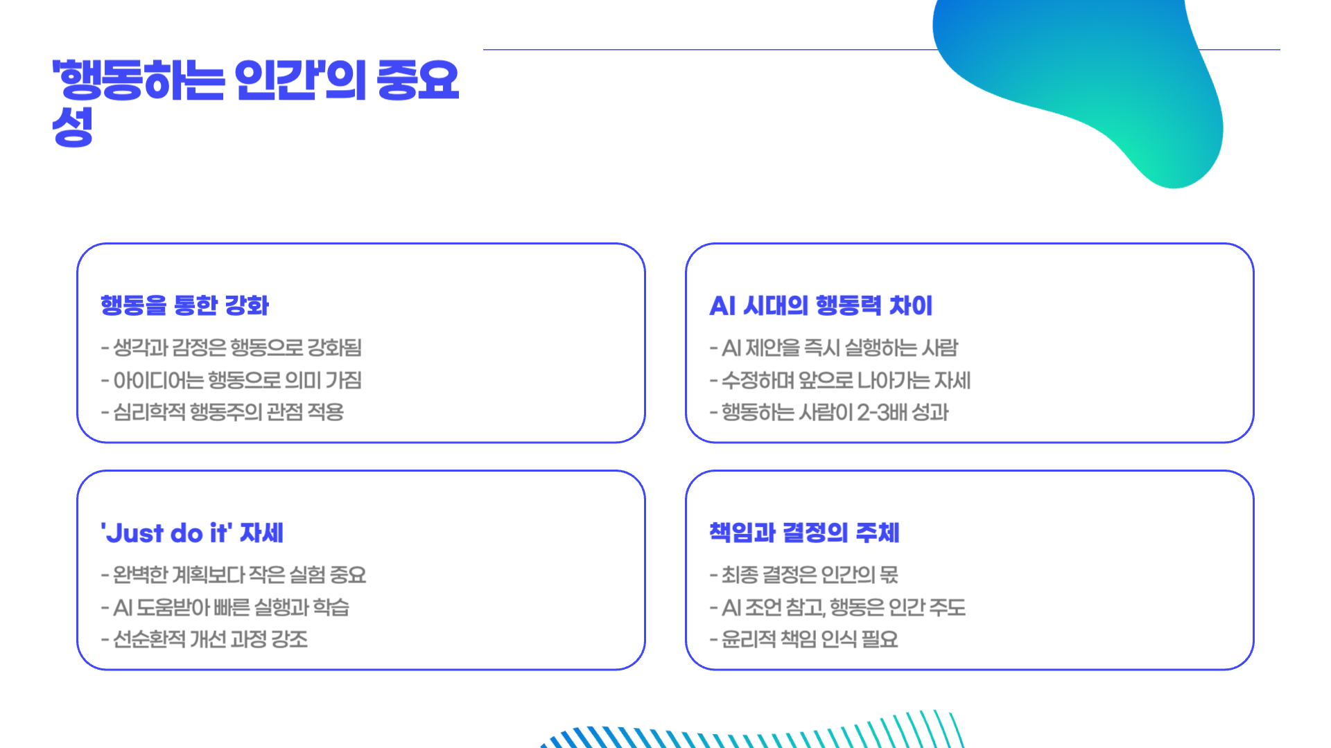 또 하나 강조하고 싶은 것은 **“행동하는 인간”**의 중요성입니다. 심리학의 행동주의 관점에서 보면, 사람의 생각과 감정도 행동을 통해 강화되고 변화합니다. 아무리 훌륭한 아이디어와 계획도 행동으로 옮겨지지 않으면 의미가 없습니다. 이제 AI가 생각의 보조자 역할을 해주면서 인간은 오히려 행동력에서 차이가 날 것입니다. 어떤 이는 AI가 제안한 것을 즉시 실행에 옮기고, 또 수정하며 앞으로 나아갈 것이고, 다른 이는 AI가 많은 걸 해주니 안주하며 머뭇거릴 수도 있습니다. 행동하는 사람이 AI의 도움까지 받아 두 배, 세 배 성과를 낼 것이 자명합니다. 저는 그래서 **“Just do it”**의 자세를 특히 강조합니다. 완벽한 계획을 세우느라 시간을 보내기보다는, AI의 도움을 받아 일단 작은 실험이라도 해보고 거기서 배우는 선순환이 중요합니다. AI에게 주권을 넘겨주는 문제도 결국 인간이 스스로 행동하고 결정하지 않으면 저절로 일어나는 위험입니다. 예컨대 중요한 사업전략 결정을 AI에게 모두 맡겨버린다면 편할지 모르지만, 그 결과에 대한 책임과 영향은 결국 사람이 지는 것입니다. 그러니 결정의 최종 주권은 반드시 인간이 쥐고 있어야 하며, 이를 위해서는 AI의 조언을 참고하되 최종 행동에 옮기는 주체는 인간이라는 원칙이 필요합니다.