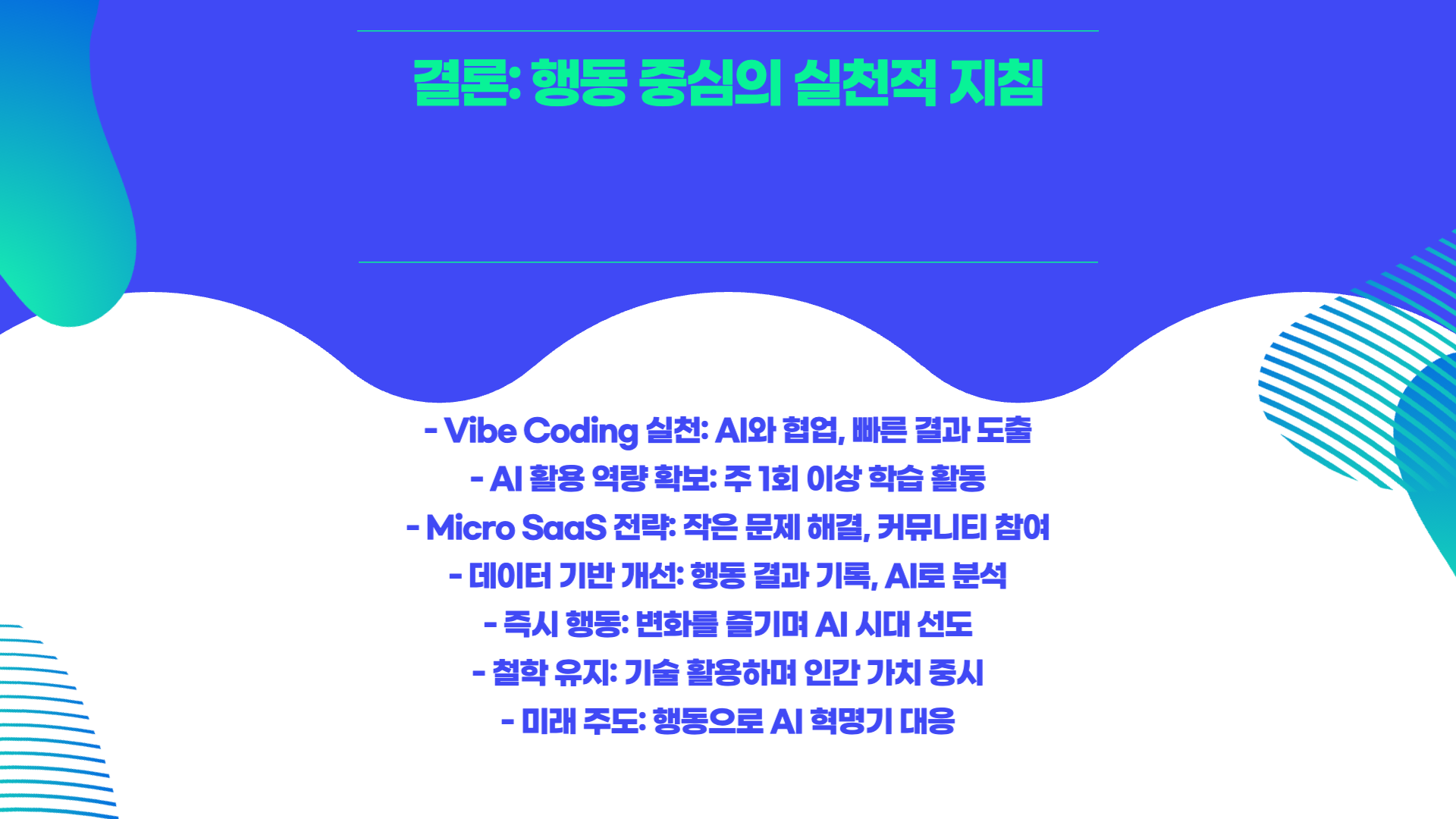AI 시대의 거대한 변화 속에서 우리가 잊지 말아야 할 것은 결국 행동하는 인간의 역할입니다. 아무리 훌륭한 AI 전략과 도구가 있더라도 그걸 활용해 가치를 창출하는 것은 우리의 행동이기 때문입니다. 이제 결론적으로, 스타트업 창업자와 실무자들이 곧바로 실천할 수 있는 행동 중심의 지침을 몇 가지 제안드리겠습니다.