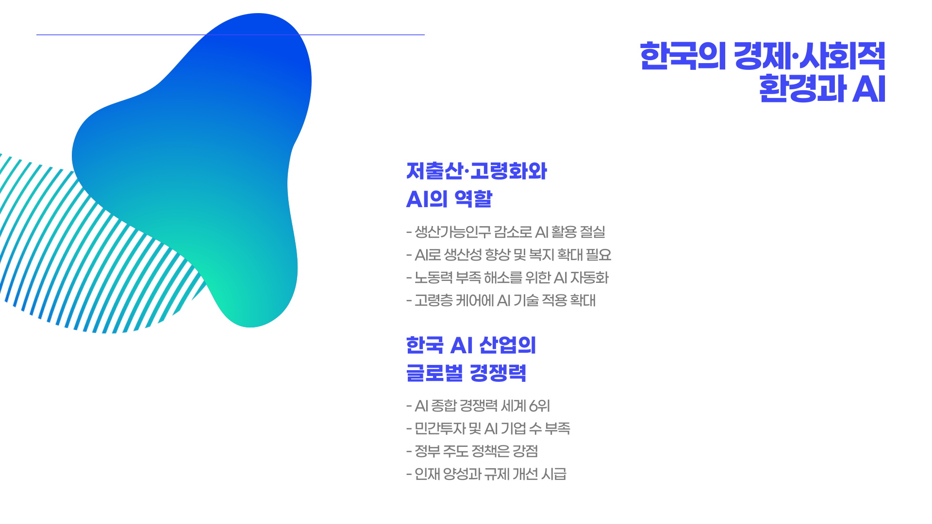 요약하면, 한국은 AI 혁신으로 경제·사회적 난제를 해결해야 할 절박한 처지입니다. 인구 감소로 생산성 향상 없이는 지속 성장이 어려운 구조이며, AI 분야에서도 선진국 대비 추격전략이 절실합니다. 과감한 투자와 규제혁신, 인재양성을 통해 한국이 가진 ICT 기반을 AI 시대에도 이어간다면, 위기를 기회로 반전시킬 수 있을 것입니다.